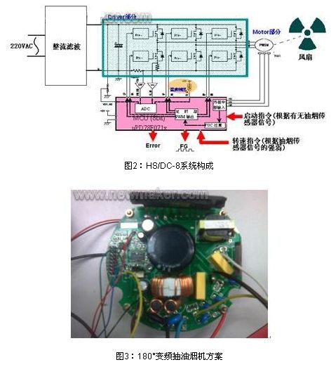 瑞萨电子开发了一套基于8位MCU ――uPD78F071x的低成本180°变频抽油烟机方案HS/DC-8,该方案包括电源和电机控制部分(见图2)。