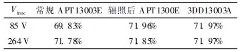 表3是AP3765序列充电器中采用经过10 kGy电子辐照的APT13003E 及3DD13003A 在85 V 和230 V 输入电压下输出负载电流分别是0. 15 A、0.30 A、0. 45 A、0. 60 A 系统平均效率的结果。从表3中可以看出, 10 kGy电子辐照后的APT13003E的效率与3DD13003A 的效率基本相同。