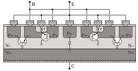 采用钳位型开关晶体管也能降低开关晶体管的关断延时, 其原理是通过钳位电路使VBC在晶体管导通时不能增加到深饱和所需的0. 7 V, 这样注入集电结两侧的少子很少, 使超量储存电荷很少, 这样储存时间大大缩短。采用钳位型开关晶体管主要有两种, 一种是在集电结并联肖特基二极管的晶体管,由于在高温下漏电电流较大, 其ts - Vcesat的Trade??o ff关系最差, 目前应用较少。另一种是横向PNP钳位型晶体管, 其结构图如图6所示, 它在高温下漏电较小, 能得到较好的Trade-off关系,电流放大系数基本不变, 目前得到了越来越多的应用, 如吉林华微电子股份有限公司研发的产品3DD13003A 就采用了这种结构。