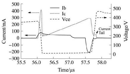 在开关晶体管关断时, 集电极电流不能马上降为0, 而集电极电压已经从Vcesat开始上升, 在开关晶体管上产生电压电流交替现象, 从而产生关断损耗。