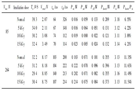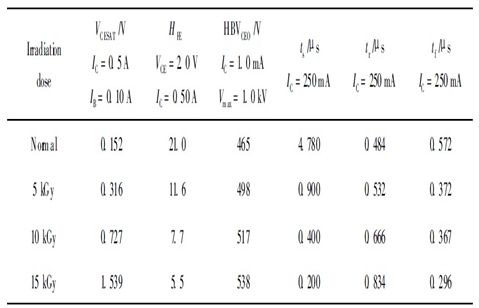 从表1中我们可以看到, 经过辐照后, 储存时间ts 随着辐照剂量的增大有很大幅度的减小, 下降时间tf 有所减小, 上升时间tr 有所增加; 电流放大系数随着辐照剂量的增加而下降; 饱和压降和击穿电压HBVceo随辐照剂量的增大而增大。