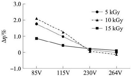 图3 电子辐照后的APT13003E与常规的APT13003E在各个交流输入电压下系统平均效率增加百分比[page]
