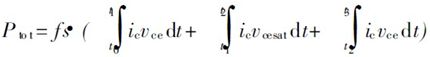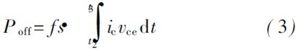 开关晶体管在工作过程中的损耗分为开关损耗和稳态损耗, 其中开关损耗包括导通损耗和关断损耗, 稳态损耗包括通态损耗和截止损耗, 其中截止损耗占总的损耗的比率很小, 可以忽略不计。我们把Vce由90% Vindc降到110% Vcesat所用的时间定义为导通延时, 即图2中的t1 - t0, 把IC 由90% Icmax下降到0所用的时间定义为关断延时, 即t3 - t2。