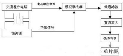 为了解决上述各方法的缺陷,本文采用了四端子测量方式,将蓄电池两端上的电压响应信号通过交流差分电路与产生恒定交流源的正弦信号经过模拟乘法器相乘,再将模拟乘法器的输出电压信号通过滤波电路,使交流信号转变为直流信号,直流信号经直流放大器放大后进行模数转换,将转换后的值送入单片机进行简单处理。