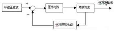 电路组成框图如图2所示:这是一个闭环控制系统,电流负反馈电路。标准正弦波产生一个频率稳定、对称、失真度低的1KHz正弦波信号。驱动电路把正弦波放大,去推动功放电路,得到正弦交流电流输出。恒流控制电路从功放输出中得到的信号,通过与给定的信号相比较,来调节驱动电路的信号,从而使输出电流保持稳定。