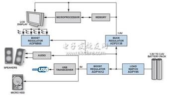 图1显示采用两节串联的AA电池供电的典型低功耗系统。电可用输出范围约为1.8 V至3.4 V,而IC工作时需要1.8 V和5.0 V 电压。升压转换器可在不增加电池单元数量的情况下提升电压,从而为WLED背光、微型硬盘驱动器、音频设备和USB外设供电,而降压转换器可为微处理器、内存和显示器供电。