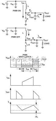 注意,开关调节器既可以连续工作,也可以断续工作以连续导通模式 (CCM), 工作时,电感电流不会降至0;以断续导通模式 (DCM),工作时,电感电流可以降至0. 电流纹波,在图2中显示为ΔIL 使用公式ΔIL = (VIN × tON)/L.计算。平均电感电流流入负载,而纹波电流流入输出电容。