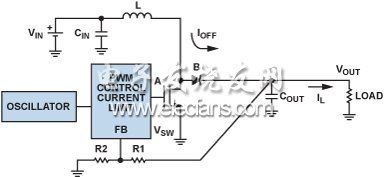 使用肖特基二极管代替开关B的调节器定义为异步 (或非同步), 调节器,而使用FET作为开关B的调节器定义为同步调节器。图3中,开关A和B已分别使用内部NFET和外部肖特基二极管来实施,从而形成异步升压调节器。对于需要负载隔离和低关断电流的低功耗应用,可添加外部FET,如图4所示。将器件的EN引脚驱动至0.3 V以下便可关断调节器,使输入与输出完全断开。