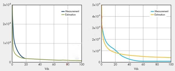 图2(a)显示了输出电容的测量值及由公式(3)得出的拟合曲线。然而,对于具有更多非线性特性的新式超级结MOSFET而言,则简单的指数曲线拟合有时不够好。图2(b)显示了最新技术MOSFET的输出电容测量值及用公式(3)得出的拟合曲线。两者在高压区的差距将导致等效输出电容的巨大差异,因为在积分公式中电压与电容是相乘的。图2(b)中的估计将得出大得多的等效电容,这会误导转换器的初始设计。