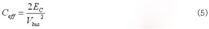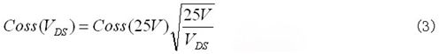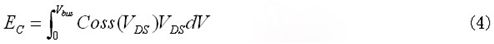 如果依据漏源电压变化的输出电容值可得,则输出电容储能可用公式(4)求出。虽然电容曲线显示在数据表中,但要想从图表中精确读出电容值并不容易。因此,依据漏源电压变化的输出电容储能将由最新功率MOSFET数据表中的图表给出。通过图3显示的曲线,使用公式(5)可以得到期望的直流总线电压下的等效输出电容。