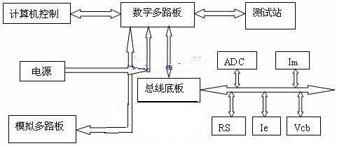 热阻测试系统的基本构架是计算机通过软件控制精密模拟和数字电路,实现对被测器件的条件施加→结果采样→筛选→计算→比较→判别等一系列程序控制,完成对被测器件电参数的自动测试,每次测试的全过程小于0.2秒。系统主要有模拟多路板、数字多路板、ADC板、Im 板、Ie板和Vcb板组成,如图1所示。