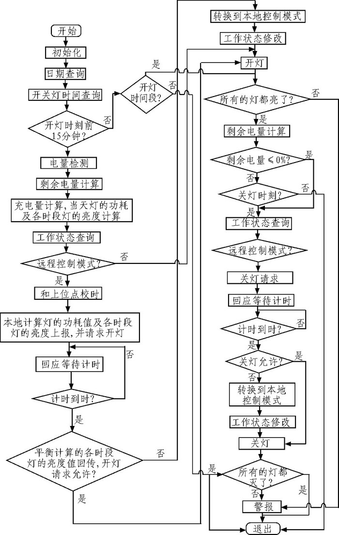 进行太阳能路灯电池板电流检测,蓄电池电压检测,蓄电池电量监测,以及环境温度的检测,采用光开时关,并实时上传工作环境及状态数据,预警故障,保证系统的可靠性。图2为太阳能路灯的开、关控制流程网。