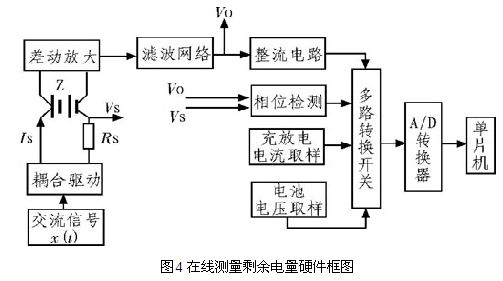 给电池施加一个固定频率和固定电流(日前一般使用l kHz频率、50 mA小电沆),然后对其电压进行采样,经过整流、滤波等一系列处理后通过运放电路计算出该电池的内阻值。图4为在线测量剩余电量硬件框图。