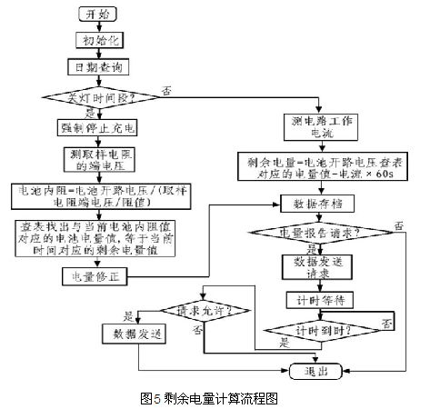 通过计算电流在时域上的积分,可得出电量变化值,在路灯工作前检测到的电池电量作为初始电量,则剩余电量为初始电量减去电量变化值。同时通过对MPPT电路的输出电流做积分,作为电量变化的校正值,从而得到较准确的剩余电量值。图5为剩余电量计算流程图。
