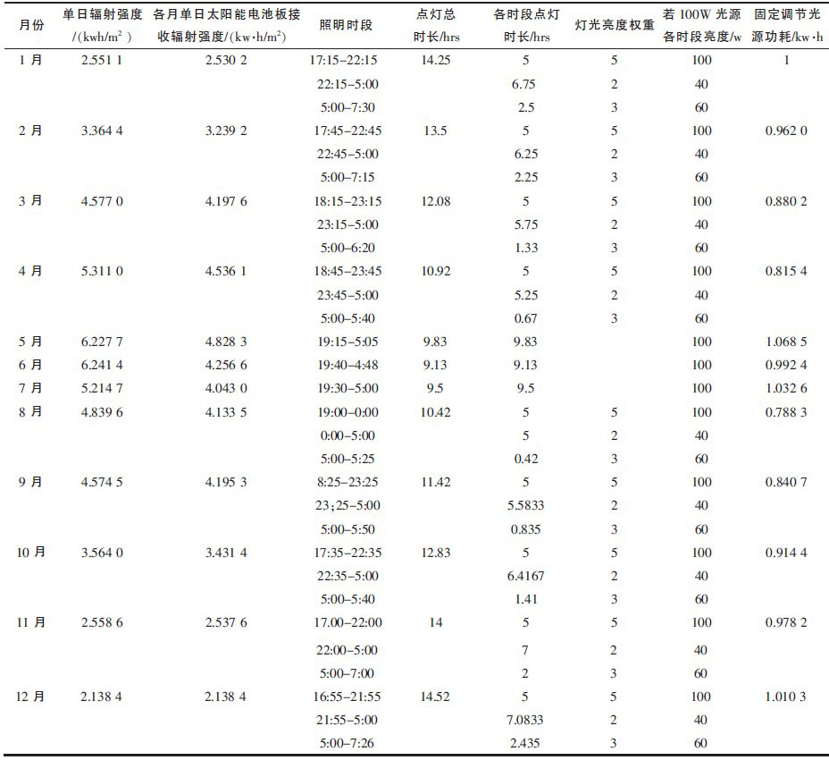 开关灯的时间根据天安门升降旗时间而定,如表1所示,全年最长点灯时长茌12月为14.52小时,最短为9.13小时。照明时间分为3个时段,第一个时段从当天天安门降旗时刻开始,为5个小时,第二个时段到早上5点,第三个时段从5点到灭安门升旗时刻,灯光亮度各时段权重比为5:2:3,如果以100 W光源为设计标准,则光源功耗最大为1.068 5 kW-h。