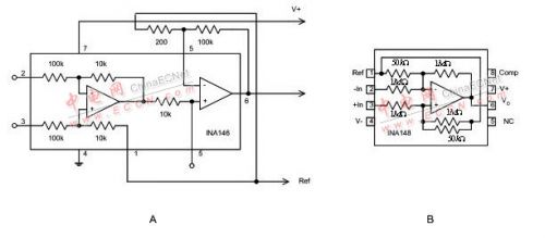 老式分路检测电路基于差动放大器,即周围带四个电阻来设置增益并提供差动输入的运算放大器 (operation amplifier)。这些电阻使运算放大器能接受超过其电源轨的共模电压。不过,这也会带来下面一些负面问题:一是电路必须配置为衰减器,在随后的运算放大器级中恢复增益,如图 2A 中的 IC 结构图所示,运算放大器的增益会成倍增大第一个放大器的偏置和漂移量,从而降低整体性能。二是采用高共模电压差动放大器要增加电阻网络,以使之在仍然只提供单位增益的同时能够接受较高的共模电压。高共模差动放大器带来的影响在于:运算放大器的噪声增益与共模衰减成正比,如图 2B 所示的差动放大器结构采用了 20:1 的内部共模衰减,此举使放大器的偏置、漂移和噪声都比运算放大器本身扩大了 20 倍。此外,较大的输入电阻也会造成较高的噪声。
