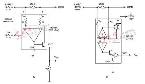 电流分路.是专门用于分路电流检测的高共模电压差动放大器,能够解决电阻型差动放大器的局限性。电流分路.与差动放大器相比的主要区别在于:其共模电压功能通常只扩展到正电压,而一些电流分路.允许共模接地。这会造成更多的衍生情况,我们随后还要谈到。共模电压功能也允许扩展到负电压。电流分路.从一开始设计时就是以单电源电压工作的,通常最低电压可达 2.7V。图 3 显示了两类电流分路.,分为电流输出型分路.和电压输出型分路.。电流输出型分路.通常静态电流较低,需要外部输出电阻,从而使终端用户能够设定增益。电压输出器件采用固定增益且不需要其他组件。
