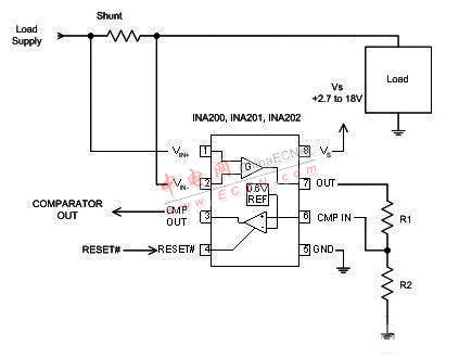 在许多应用中,电流应与某个设定值相比较。通常说来,进行电流比较还需要电流分路.、比较器和参考电压。此外,理想的比较器输出应与大多数常见的逻辑电路很好地兼容。图 5 给出了电流比较的例子。在本例中,将电流与采用 TI INA200 系列电流分路.和比较器的简单单电压结点进行了比较。R1 和 R2 形成分压器,以根据 INA200 系列比较器的内置 0.6V 电压结点来设置电压结点。(INA200 系列的增益很有特点:INA200 的增益为 20,INA201 的增益为 50,INA202的增益为 100。)