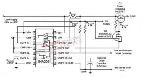 图 6 显示了电流与两个电压结点比较的电路。较低的电压结点激活警报输出,我们可为其配置一个适当的延迟电路,以避免错误的瞬态触发。较低的电压结点在比较器输入端内置阈值为 0.6V。Q1 为较高电压结点输出提供缓冲,通过电源开关 MOSFET 关闭电源,如果电流超过上限则启用 Q2。较高电压结点采用 INA206 的 1.2V 参考电压,INA206 具有避免在没有锁存功能的电压结点发生振荡的锁存功能。