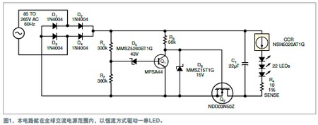 图1的电路包括一个桥、一个斩波器,以及一个电流调节器。全波桥包括二极管D1、D2、D3和D4,其输出送入斩波电路。MOSFET管Q2立即导通,电容C1开始充电。