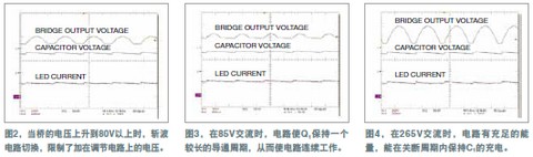 图4显示的是输入电压为265V交流时电路的工作情况。轨迹1表明,由于其输入电压高,Q1导通时间短。而轨迹2则显示仍保持有充足的能量给Q1充电,在关断周期内也能维持通过LED的电流。