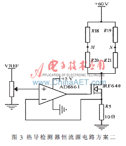 如果只是单纯地将IRF640放在电桥的上方,而不加线性光耦HCNR201。如图4所示,当场效应管IRF640截止,则M、N上的共模电压为零,这样虽然可以避免图3方案的问题,但是当桥流较大时(200 mA,桥电阻为100Ω),则场效应管IRF640的栅极电压达到20多伏,超过了AD8661的电源电压范围(±18 V)。因此图3、图4方案都不可行。