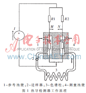 热导检测器是利用被测成分和载气的导热系数不同而响应的浓度型检测器,如图1为热导检测器工作原理图。由图1可以看出,只通入载气时,惠斯通电桥处于平衡状态,M、N两点电位相等,电位差VMN为零。再通入样气后,由于参考臂上通入的是纯载气,而测量臂上通入的是载气和样气的混合气体,其导热系数不同于纯载气,从热丝向四周传导的热量也就不同,从而引起两臂热丝温度不同,进而使两臂热丝阻值不同,电桥平衡破坏。M、N两点电位不等,即存在电位差VMN不为零,通过对VMN电压进行检测、分析,从而定性、定量地测出被测物质的成分和含量。