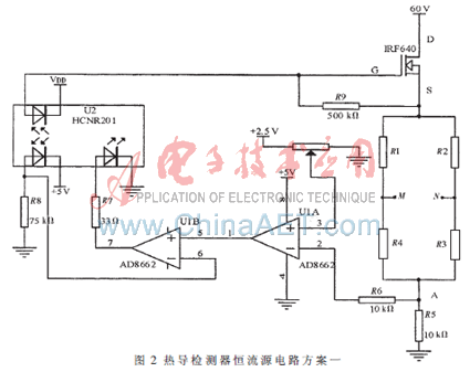 如图2所示为恒流源的电路图。输出信号为M、N,即通过测量M、N两点间的电位差,就能测出物质的成分和含量。图2中R5是采样电阻,阻值10 Ω,当电流为上限250 mA时,采样电压为2.5 V,采样电压输入到AD8662的2脚,AD8662的3脚接电位器RW,RW的一端接地,另一端接+2.5 V电压基准,此+2.5 V是通过稳压芯片ADR431输出,温度稳定1 ppm/℃。设定好电位器的电压后,当AD8662的2脚、3脚电压不相等时,其差压经运放AD8662开环放大(开环放大倍数2.2×105)驱动AD8662的5脚,U1B和线性光耦HCNR201构成光耦隔离的放大电路,放大比为500 K/75 K=6.7倍。AD8662和HCNR201构成放大比1.47×106的差压放大电路,并且起到稳流作用。当桥流有0.1 μA的波动时,施加到IRF640栅极的电压变化达1.47 V,使IRF640增加或减小电流,从而消除电流波动。