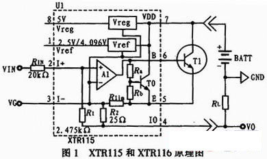 XTR115和XTR116用SO-8小型化封装,其结构组成及原理图如图1所示,XTR115和XTR116内部电路主要由3部分组成。