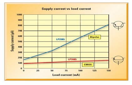图 1:不同的低压降稳压器在满载电流范围内的供电电流 (Iq) 比较,比较的两款大致相同的 150mA 低压降稳压器分别采用 CMOS 及双极工艺技术制造