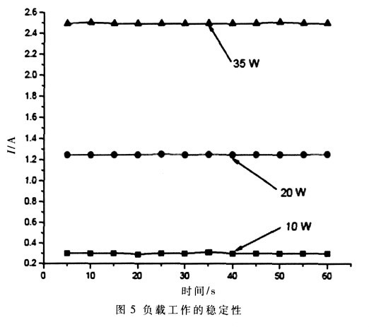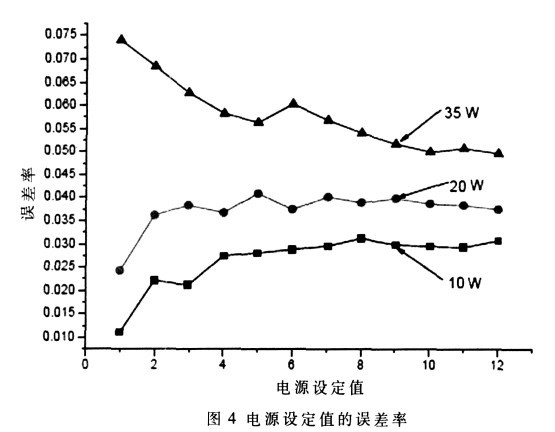 由于输出电流达到8 A, 对电源的功率要求较高, 易产生噪声, 这种随机噪声也会对输出电流产生一定的影响。为减弱这种噪声, 各个??榉直鸸┑纾?以减少交叉干扰, 同时在电路板上多加装去耦滤波电容, 减小干扰的影响, 同时OPA549 能有效地抑制纹波。影响电源稳定性的因素很多, 如负载的变化、取样电阻的变化、A/D、D/A 的影响等。如图4 所示, 不同负载的情况下, 电源误差不同。10 W 的负载, 由于功率较低, 在电压、电流增加时, 误差变化也较小。35 W 的负载, 由于功率较大, 工作电流的变化范围比较大, 功耗较大, 电源的误差变化相应地也比较大。如图5, 在10 W、20 W 和35 W 的负载时, 工作状态稳定, 能够满足大电流、大功率的需要。