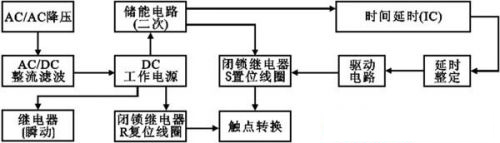 断电延时继电器整体构成包括断电延时继电器电源部分(经降压、整流、滤波)以提供断电延时继电器内置瞬动电磁继电器和2绕组闭锁型R复位线圈工作);二次电源部分(供断电后延时部分与2绕组闭锁型S置位线圈工作);延时工作部分(可编程定时集成或CMOS计数分频集成);驱动部分;执行继电器部分组成(图1)。