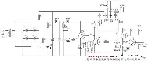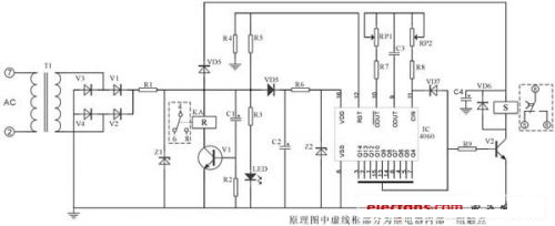 该电路核心部分由IC4541构成,延时设定由RP2、C*设定,A-B端根据需求接相应高、低电平(设定端)内部2绕组闭锁继电器采用DC12V(因继电器工作电压与IC4060组成延时电器要低,则为保证其驱动则分别由V6、V7、V1、V3构成)。其中C2为二次储能器件,可根据延时的长短予以调整,C4为完成S置位线圈工作。