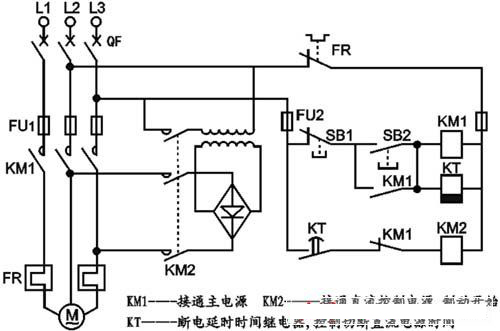 制动过程:按下停止按钮SB1→KM1断电,KM1主触点断开,电机脱离电源,KM1辅助常闭触点恢复闭合,KM2通电,接入直流电源,制动开始,同时KM1辅助??サ阌只指炊峡?,则KT线圈呈断电状态,延时开始,待所设延时时间到达后,KT的延时断开??サ慊指炊峡?,KM2失电,切断直流电源,制动结束。