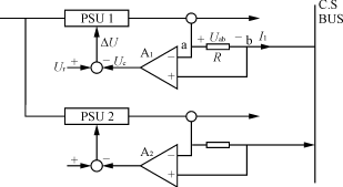 如图5所示,当输出达到均流时,输出电流I1为零。反之,则电阻R上由于有电流I1流过,在其两端产生一个电压Uab,这个电压经过放大器A输出电压Uc,它与基准电压Ur比较后的ΔU,反馈回电源模块的控制部分,从而调节输出电流,最终实现均流。