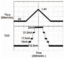 通过将背光调整到合适的水平,就可以显著减少从电池吸收的功率。图3显示了一种使用情况,突出了在5个亮度区使用系统可能实现的电力节?。貉艄狻⒁跆焓彝?、明亮的办公室、昏暗的房间、夜间/电影院。亮度值分别设置为100%、85%、70%、60%和50%(25mA、21.3mA、17.5mA、15mA和12.5mA)。由于ALS的电压上升(或通过传感器增加环境光),在驱动器迫使LED电流变化之前,驱动IC在预定时间内对ALS电压采样。规定(或平均)时间内的ALS电压采样有助于防止在瞬息万变的照明条件下出现LED闪烁。