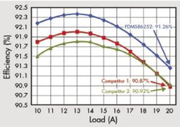 在针对隔离型和非隔离型DC-DC应用中如何提高效能,我们基于一款1/16砖的平台上做了一系列的比较试验。在采用了飞兆半导体FDMS86252与主要竞争对手产品比较,效率提升范围最小为0.4%,最大为超过1%,也就是有0.32W的功率提升,从图中可以看出,上面的曲线为采用了飞兆半导体FDMS86252的测试曲线。