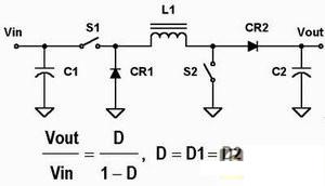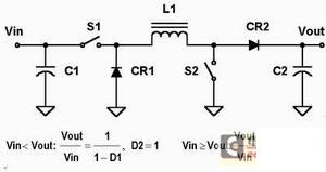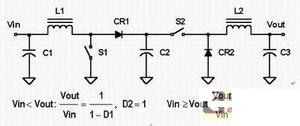 图1a的电路尽管是四个电路中最复杂的,却有几个优点。它的输入和输出电流被电感平滑处理,减小了输入和输出端的纹波电流以及对电容C1和C3的电流应力。但是这一方案也有缺点,电容C2的电流不管是当Vin小于Vout时来自CR1还是当Vin大于Vout来自S2,它都会有中断,而且它需要两个电感。