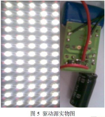 为了进一步验证了基于恒流二极管的小功率LED 驱动电路的可行性。制作了驱动65 颗(5*15方式连接)0.06 W 白光LED 的驱动源,其中降压电容C1 为1.5 μF,滤波电容C2 为1000 μF,恒流二极管为两颗2DHL040 并联,并利用万用表对电流电压进行测量。实际测得输入电压在196~248 V范围内输出电流恒定为80 mA,相当于流过每个LED 电流为 16 mA。在219 V 输入电压条件下,整个电路消耗的功率为 7.1 W ,则驱动源的功率因素为 0.47。图5 为制作的小功率驱动源实物图。