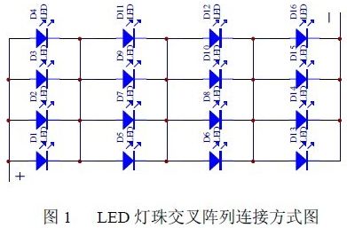 从图中可以看出当其中个别LED 短路或断路,也不会引起整个灯组熄灭。这种交叉阵列连接方式具有线路简单,亮度稳定,可靠性高,对驱动要求较低等特点。