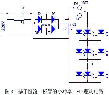 基于恒流二极管的市电供电小功率LED 驱动电路如图3 所示: