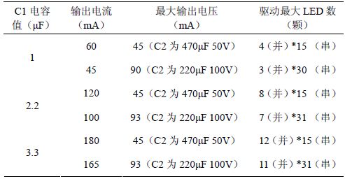 C1 为降压电容,电容降压电路输出电流主要与降压电容容量和输出电压有关,输出电压越高电流越小。理论上驱动电路输出电压可以达100 V 以上,但考虑到高电压下滤波电容C2 的体积较大,不易于电路安装,本文设计的驱动电路主要使用50 V和100 V 的滤波电容。虽然电容容值越大驱动电路输出电流越大,但降压电容值太大会降低整个驱动电路的安全特性与稳定性,因此建议降压电容的容值不要超过3.3 μF。下表1 给出了采用0.68~3.3 μF不同大小降压电容,驱动电路在不同电压下提供的电流以及能够驱动的最多LED 数量。(此表中的数据为多次实验与仿真所得)