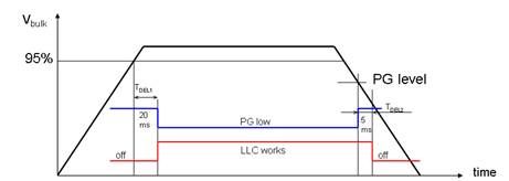 4. PFC异常检测:PFC异常检测的目的在于,如果PFC没有正常工作,那么即使出现高线路电压,PFC和LLC均应停止工作。例如,在高线路电压时PFC驱动器电阻损毁的情况。实现PFC异常检测保护的方法是:如果VCTRL保持在最高电平或低于最低电平,如VCTRL引脚异常短路,且时间长于1秒(tPFCabnormal),则PFCok内部信号下降,PGout引脚立即释放开路,通知系统电源将关闭;5 ms后LLC停止工作(tDEL2)。