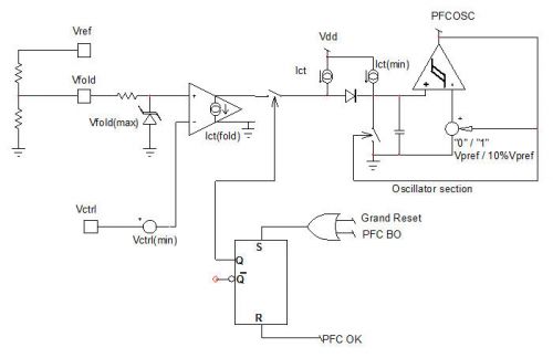 在下列情况时,VLBO可下拉至2 V(VLBO(PD)):VLBO高于2 V(高线路电压时),以及VCTRL处于最大值的时间长于4 ms(tPFCflag);Vbulk低于额定输出的95%时。PFC Power Boost功能在启动时被禁止;最长下拉持续时间的典型值为5 ms(tLBO(PDlimit));在后续最少70 ms时间(tLBO(PDblank))内,开关保持在开路状态。