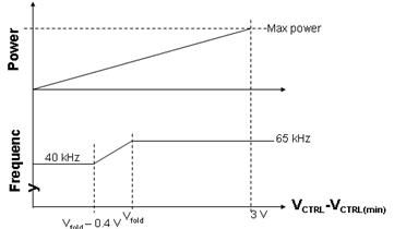 VCTRL与功率及频率的关系:当输出功率下降时,VCTRL随之下降;当到达反走设定点时,频率线性下降;65 kHz版本将最小频率内部设定为40 kHz。