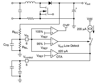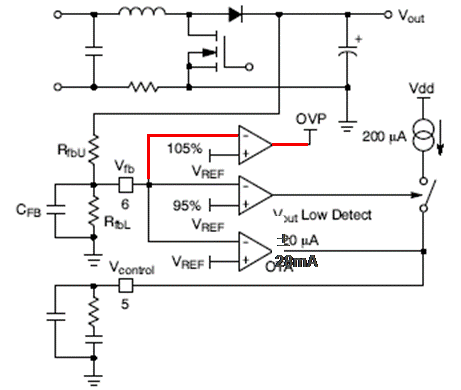 2. 快速瞬态响应/过压保护(OVP):当VFB > 105% VPREF时,过压?;ぜせ睿魇涑霰湮偷缙?;当VFB低于103.2% VPREF时,器件自动恢复工作。