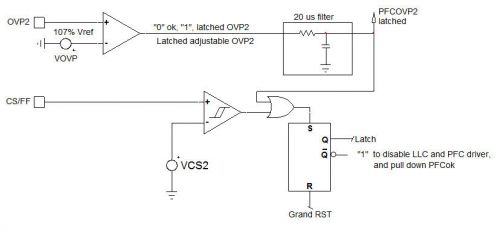 3. 冗余OVP(闩锁):专用OVP2引脚用来?;ご蟮缛荩坏缏分心谥玫?0 µs滤波器用来提供更佳的噪声免疫性。当OVP2比较器被触发时,PFC及LLC均关闭。PFCok信号假定为低电平时,PGout被释放开路,使LLC停止工作。