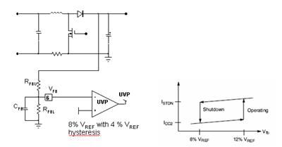 5. 欠压?;?UVP)/反馈环路异常保护:UVP可以防止在反馈故障条件下启动。当VFB < 8% VPREF = 0.2 V时,UVP激活,器件关闭;当VFB高于12% VPREF = 0.3 V时,器件自动开始工作。