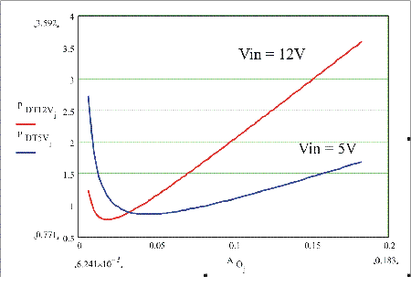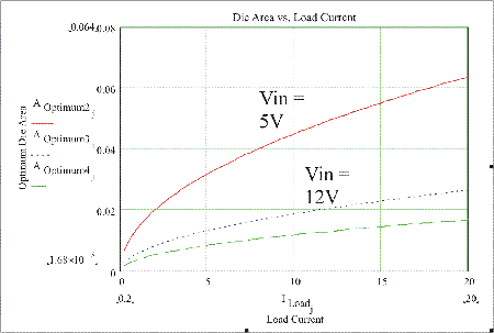 如图5所示,功耗是裸片面积的函数,周围是针对输入电压为5到12V的顶部MOSFET的最合适值。这清楚地表面,损耗高度依赖于裸片面积以及如果裸片面积增加或减少时这些损耗所增加或减小的剧烈程度。
