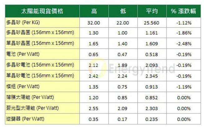 本周现货报价部分,多晶硅 、硅晶圆 、与电池依然同步呈现走跌的趋势,但除单晶硅晶圆外,跌幅都出现减缓的状态。在多晶硅方面,目前成交价最低仍维持在每公斤23美元,而平均价位下滑到每公斤25.56美元,跌幅为1.12%;而在硅晶圆部分,多晶的最低价格仍然维持在每片1.0美元;而单晶的最低价格则为每片1.4美元;本周多晶硅晶圆的平均价格来到每片1.161美元,跌幅为1.86%;而单晶硅晶圆则来到每片1.609美元,跌幅为2.48%。